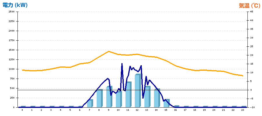 | 時刻 | 日射強度 (kW/㎡) | 気温 (℃) | 発電電力量 (kWh) | CO2削減量 (kg-CO2) | 売電金額(概算) (円) |