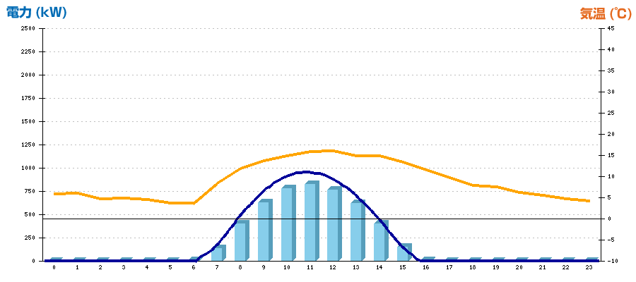 | 時刻 | 日射強度 (kW/㎡) | 気温 (℃) | 発電電力量 (kWh) | CO2削減量 (kg-CO2) | 売電金額(概算) (円) |