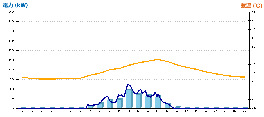 | 時刻 | 日射強度 (kW/㎡) | 気温 (℃) | 発電電力量 (kWh) | CO2削減量 (kg-CO2) | 売電金額(概算) (円) |