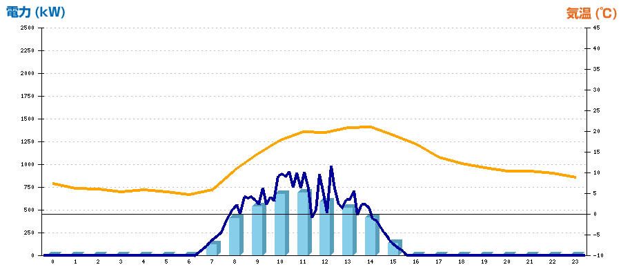 | 時刻 | 日射強度 (kW/㎡) | 気温 (℃) | 発電電力量 (kWh) | CO2削減量 (kg-CO2) | 売電金額(概算) (円) |
