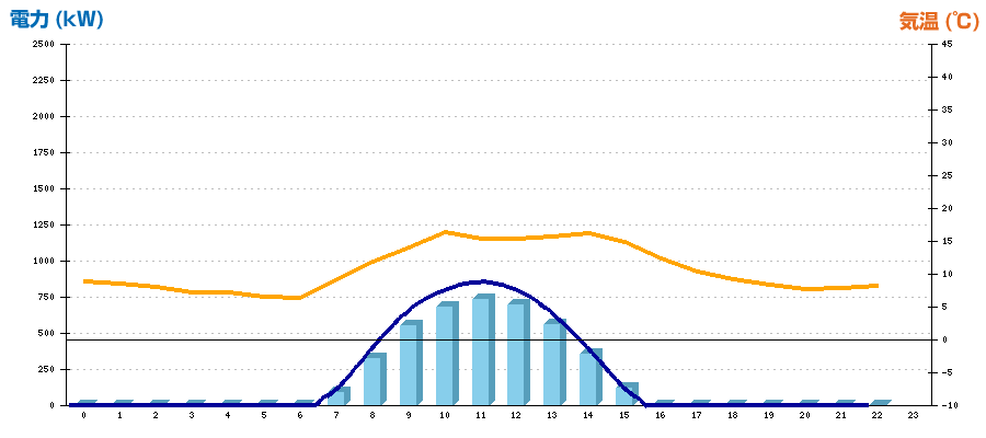 | 時刻 | 日射強度 (kW/㎡) | 気温 (℃) | 発電電力量 (kWh) | CO2削減量 (kg-CO2) | 売電金額(概算) (円) |