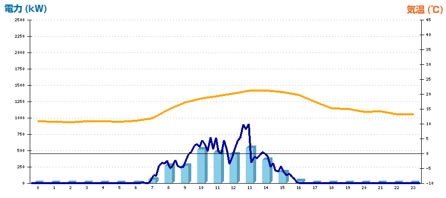 | 時刻 | 日射強度 (kW/㎡) | 気温 (℃) | 発電電力量 (kWh) | CO2削減量 (kg-CO2) | 売電金額(概算) (円) |