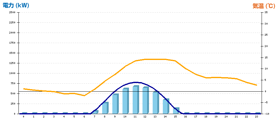 | 時刻 | 日射強度 (kW/㎡) | 気温 (℃) | 発電電力量 (kWh) | CO2削減量 (kg-CO2) | 売電金額(概算) (円) |