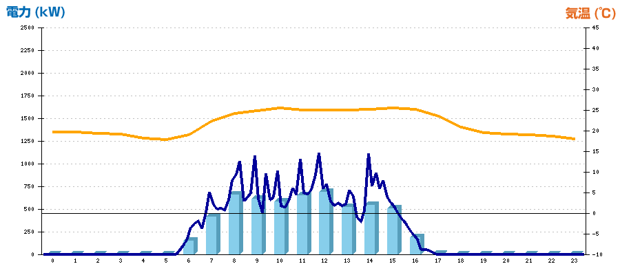 時刻 | 日射強度 (kW/㎡) | 気温 (℃) | 発電電力量 (kWh) | CO2削減量 (kg-CO2) | 売電金額(概算) (円) |
