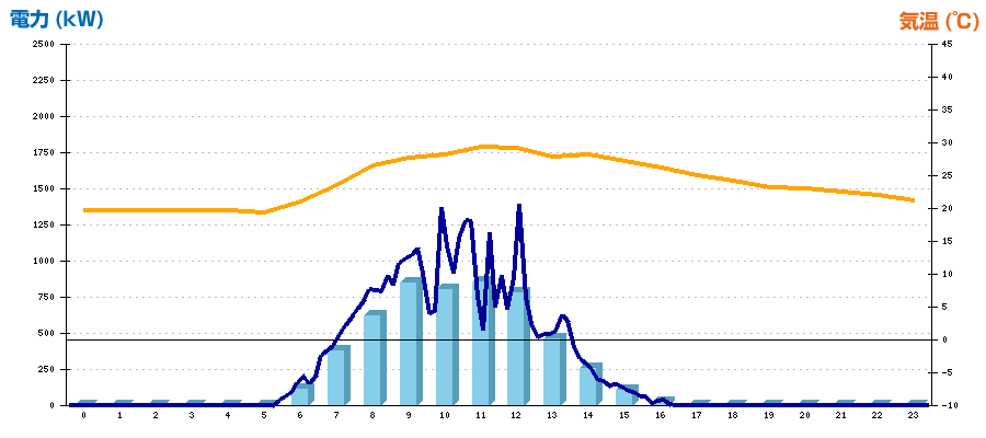 時刻 | 日射強度 (kW/㎡) | 気温 (℃) | 発電電力量 (kWh) | CO2削減量 (kg-CO2) | 売電金額(概算) (円) |