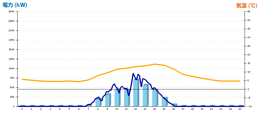 | 時刻 | 日射強度 (kW/㎡) | 気温 (℃) | 発電電力量 (kWh) | CO2削減量 (kg-CO2) | 売電金額(概算) (円) |
