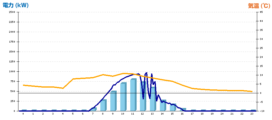 | 時刻 | 日射強度 (kW/㎡) | 気温 (℃) | 発電電力量 (kWh) | CO2削減量 (kg-CO2) | 売電金額(概算) (円) |