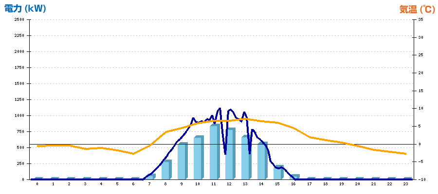 | 時刻 | 日射強度 (kW/㎡) | 気温 (℃) | 発電電力量 (kWh) | CO2削減量 (kg-CO2) | 売電金額(概算) (円) |