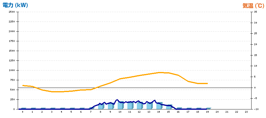 | 時刻 | 日射強度 (kW/㎡) | 気温 (℃) | 発電電力量 (kWh) | CO2削減量 (kg-CO2) | 売電金額(概算) (円) |