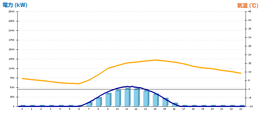 | 時刻 | 日射強度 (kW/㎡) | 気温 (℃) | 発電電力量 (kWh) | CO2削減量 (kg-CO2) | 売電金額(概算) (円) |
