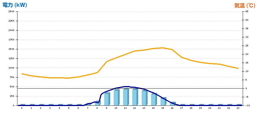 | 時刻 | 日射強度 (kW/㎡) | 気温 (℃) | 発電電力量 (kWh) | CO2削減量 (kg-CO2) | 売電金額(概算) (円) |