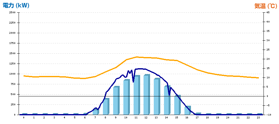 | 時刻 | 日射強度 (kW/㎡) | 気温 (℃) | 発電電力量 (kWh) | CO2削減量 (kg-CO2) | 売電金額(概算) (円) |