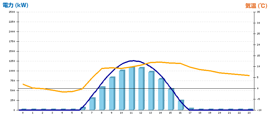 | 時刻 | 日射強度 (kW/㎡) | 気温 (℃) | 発電電力量 (kWh) | CO2削減量 (kg-CO2) | 売電金額(概算) (円) |