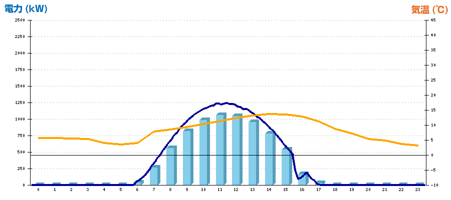 | 時刻 | 日射強度 (kW/㎡) | 気温 (℃) | 発電電力量 (kWh) | CO2削減量 (kg-CO2) | 売電金額(概算) (円) |