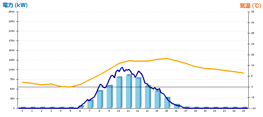 | 時刻 | 日射強度 (kW/㎡) | 気温 (℃) | 発電電力量 (kWh) | CO2削減量 (kg-CO2) | 売電金額(概算) (円) |