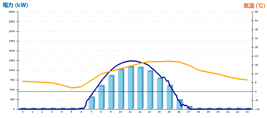 | 時刻 | 日射強度 (kW/㎡) | 気温 (℃) | 発電電力量 (kWh) | CO2削減量 (kg-CO2) | 売電金額(概算) (円) |