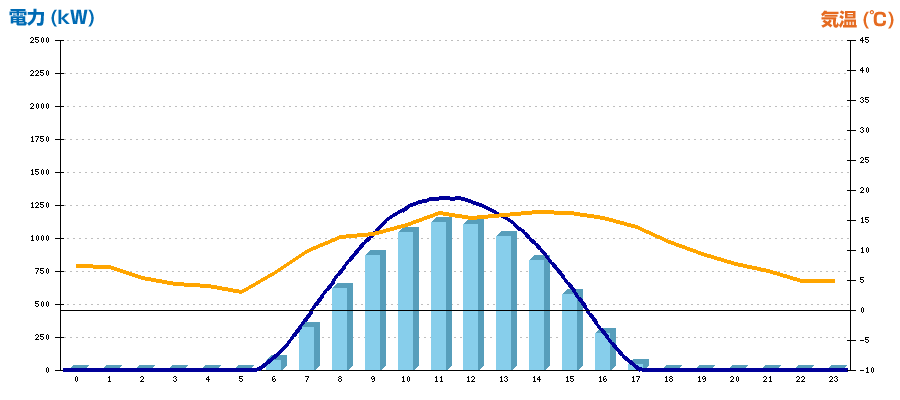 | 時刻 | 日射強度 (kW/㎡) | 気温 (℃) | 発電電力量 (kWh) | CO2削減量 (kg-CO2) | 売電金額(概算) (円) |