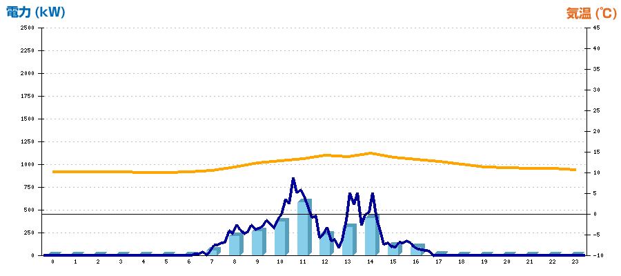 | 時刻 | 日射強度 (kW/㎡) | 気温 (℃) | 発電電力量 (kWh) | CO2削減量 (kg-CO2) | 売電金額(概算) (円) |