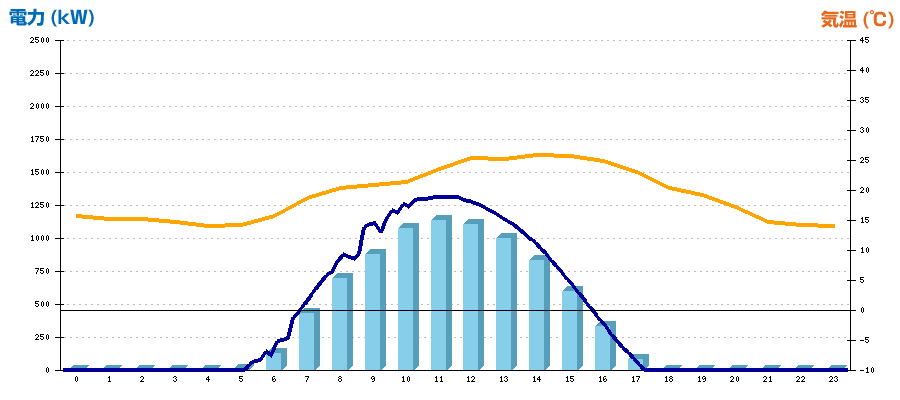 | 時刻 | 日射強度 (kW/㎡) | 気温 (℃) | 発電電力量 (kWh) | CO2削減量 (kg-CO2) | 売電金額(概算) (円) |
