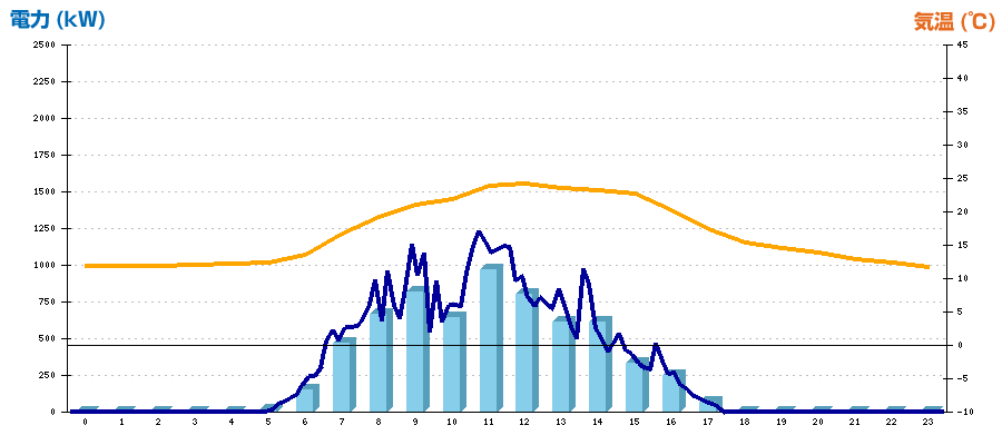 | 時刻 | 日射強度 (kW/㎡) | 気温 (℃) | 発電電力量 (kWh) | CO2削減量 (kg-CO2) | 売電金額(概算) (円) |