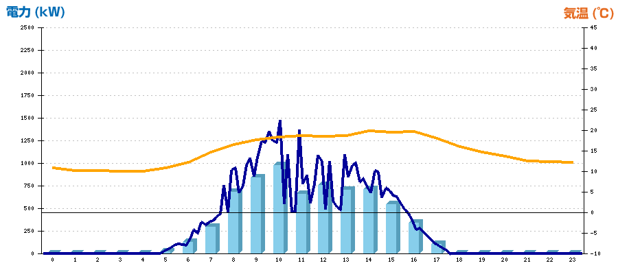 | 時刻 | 日射強度 (kW/㎡) | 気温 (℃) | 発電電力量 (kWh) | CO2削減量 (kg-CO2) | 売電金額(概算) (円) |