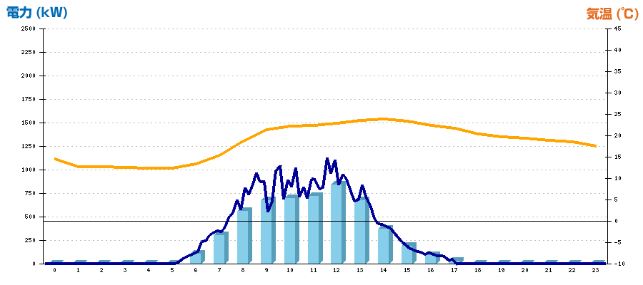 | 時刻 | 日射強度 (kW/㎡) | 気温 (℃) | 発電電力量 (kWh) | CO2削減量 (kg-CO2) | 売電金額(概算) (円) |