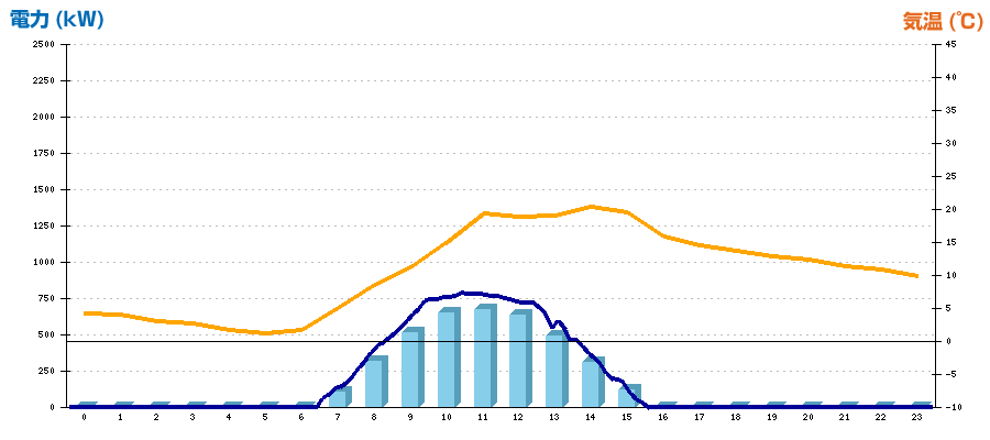 | 時刻 | 日射強度 (kW/㎡) | 気温 (℃) | 発電電力量 (kWh) | CO2削減量 (kg-CO2) | 売電金額(概算) (円) |