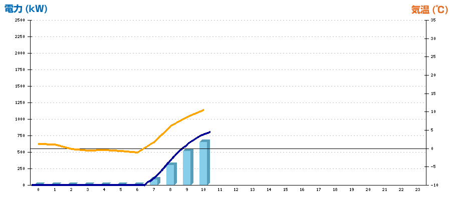 | 時刻 | 日射強度 (kW/㎡) | 気温 (℃) | 発電電力量 (kWh) | CO2削減量 (kg-CO2) | 売電金額(概算) (円) |