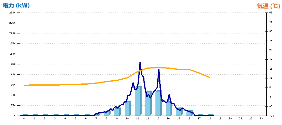 | 時刻 | 日射強度 (kW/㎡) | 気温 (℃) | 発電電力量 (kWh) | CO2削減量 (kg-CO2) | 売電金額(概算) (円) |