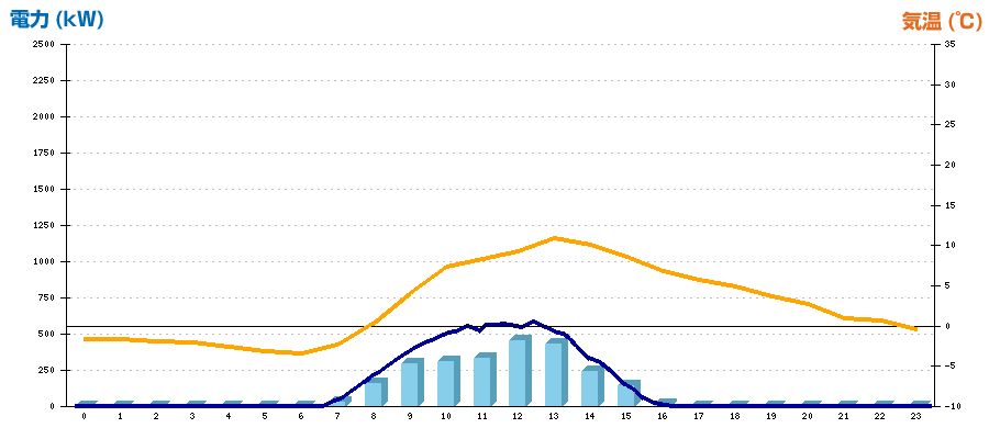 | 時刻 | 日射強度 (kW/㎡) | 気温 (℃) | 発電電力量 (kWh) | CO2削減量 (kg-CO2) | 売電金額(概算) (円) |