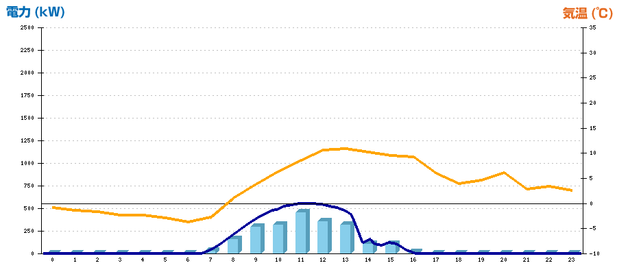 | 時刻 | 日射強度 (kW/㎡) | 気温 (℃) | 発電電力量 (kWh) | CO2削減量 (kg-CO2) | 売電金額(概算) (円) |