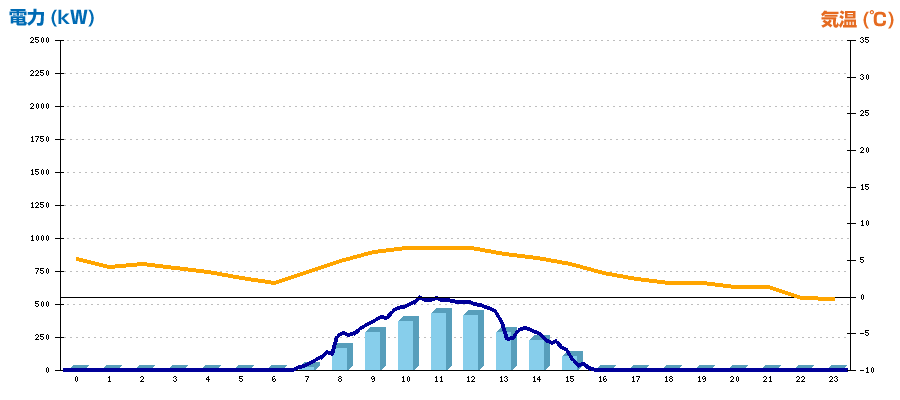 | 時刻 | 日射強度 (kW/㎡) | 気温 (℃) | 発電電力量 (kWh) | CO2削減量 (kg-CO2) | 売電金額(概算) (円) |