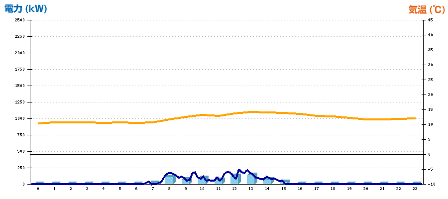 | 時刻 | 日射強度 (kW/㎡) | 気温 (℃) | 発電電力量 (kWh) | CO2削減量 (kg-CO2) | 売電金額(概算) (円) |