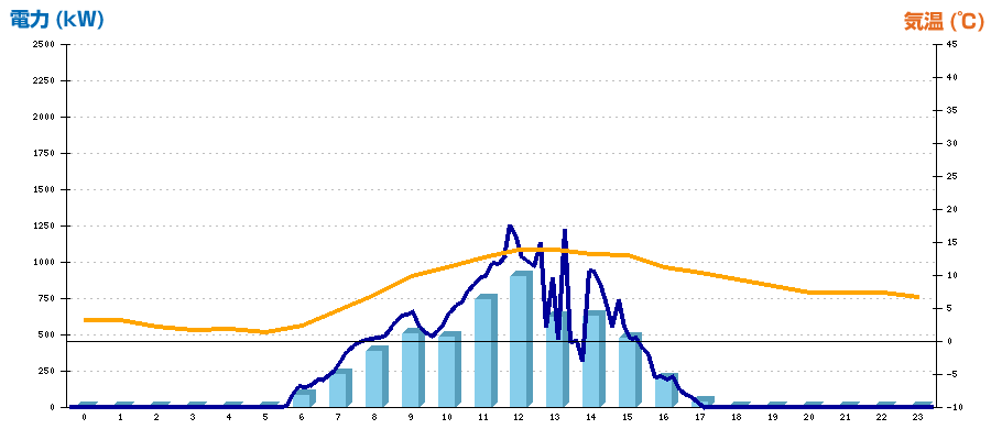 | 時刻 | 日射強度 (kW/㎡) | 気温 (℃) | 発電電力量 (kWh) | CO2削減量 (kg-CO2) | 売電金額(概算) (円) |