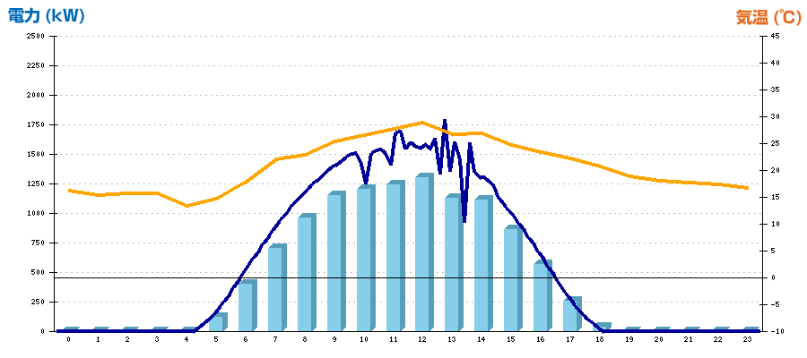 | 時刻 | 日射強度 (kW/㎡) | 気温 (℃) | 発電電力量 (kWh) | CO2削減量 (kg-CO2) | 売電金額(概算) (円) |