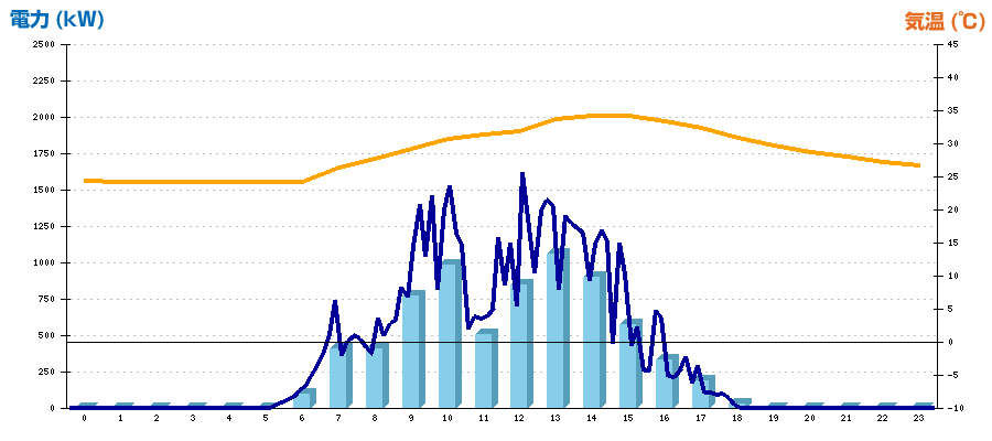 | 時刻 | 日射強度 (kW/㎡) | 気温 (℃) | 発電電力量 (kWh) | CO2削減量 (kg-CO2) | 売電金額(概算) (円) |