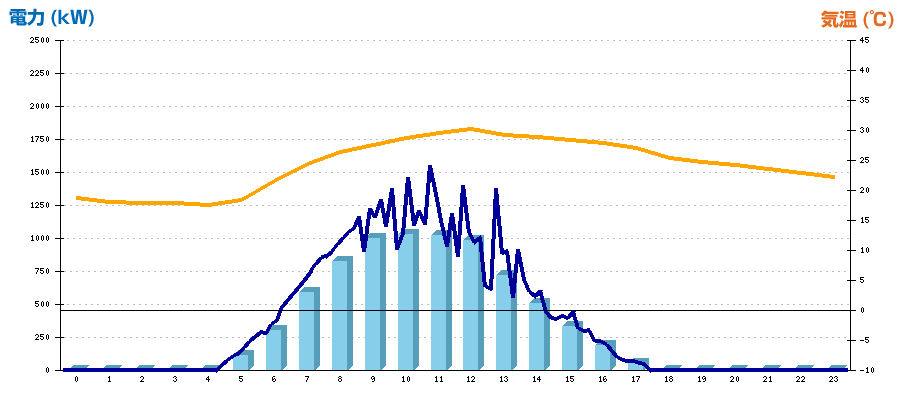 | 時刻 | 日射強度 (kW/㎡) | 気温 (℃) | 発電電力量 (kWh) | CO2削減量 (kg-CO2) | 売電金額(概算) (円) |