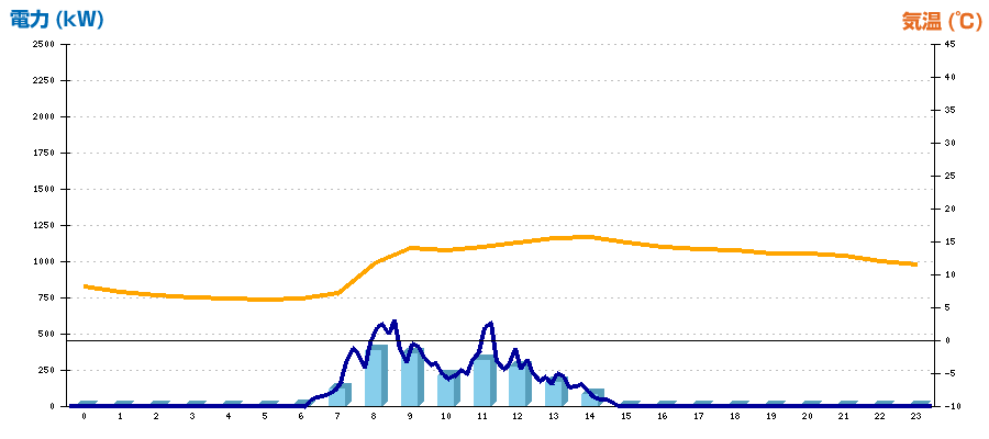 | 時刻 | 日射強度 (kW/㎡) | 気温 (℃) | 発電電力量 (kWh) | CO2削減量 (kg-CO2) | 売電金額(概算) (円) |