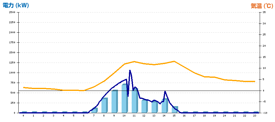 | 時刻 | 日射強度 (kW/㎡) | 気温 (℃) | 発電電力量 (kWh) | CO2削減量 (kg-CO2) | 売電金額(概算) (円) |