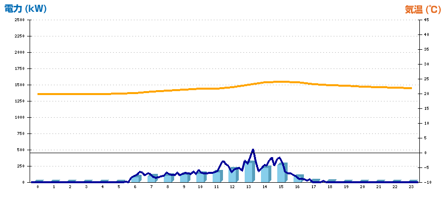 | 時刻 | 日射強度 (kW/㎡) | 気温 (℃) | 発電電力量 (kWh) | CO2削減量 (kg-CO2) | 売電金額(概算) (円) |