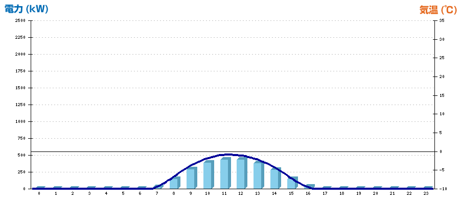 | 時刻 | 日射強度 (kW/㎡) | 気温 (℃) | 発電電力量 (kWh) | CO2削減量 (kg-CO2) | 売電金額(概算) (円) |