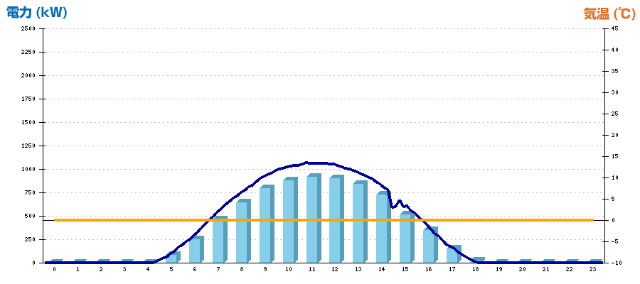 | 時刻 | 日射強度 (kW/㎡) | 気温 (℃) | 発電電力量 (kWh) | CO2削減量 (kg-CO2) | 売電金額(概算) (円) |