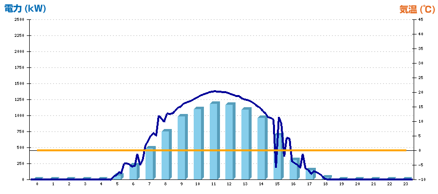| 時刻 | 日射強度 (kW/㎡) | 気温 (℃) | 発電電力量 (kWh) | CO2削減量 (kg-CO2) | 売電金額(概算) (円) |