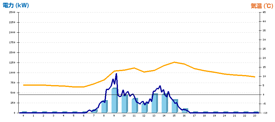 | 時刻 | 日射強度 (kW/㎡) | 気温 (℃) | 発電電力量 (kWh) | CO2削減量 (kg-CO2) | 売電金額(概算) (円) |