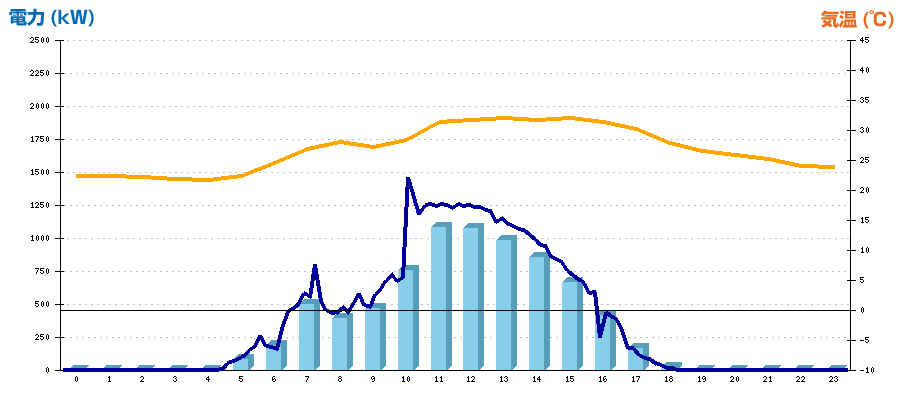 | 時刻 | 日射強度 (kW/㎡) | 気温 (℃) | 発電電力量 (kWh) | CO2削減量 (kg-CO2) | 売電金額(概算) (円) |