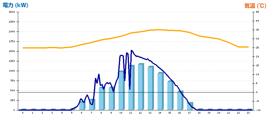 | 時刻 | 日射強度 (kW/㎡) | 気温 (℃) | 発電電力量 (kWh) | CO2削減量 (kg-CO2) | 売電金額(概算) (円) |