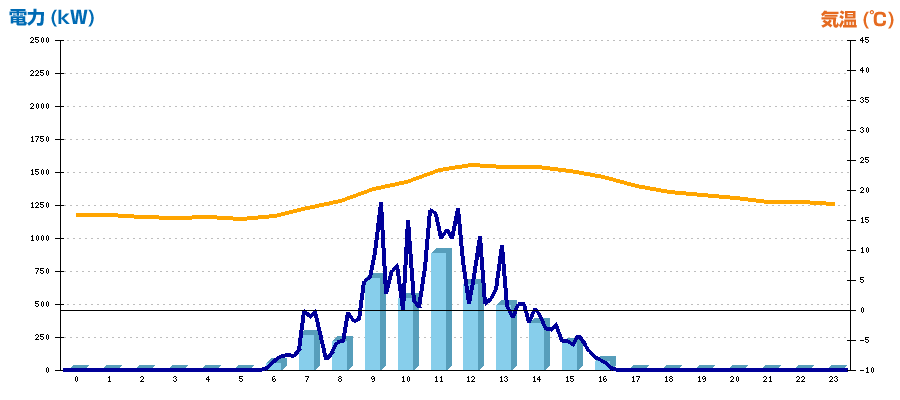 時刻 | 日射強度 (kW/㎡) | 気温 (℃) | 発電電力量 (kWh) | CO2削減量 (kg-CO2) | 売電金額(概算) (円) |