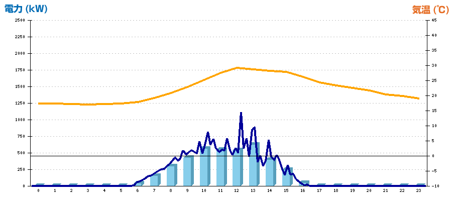 時刻 | 日射強度 (kW/㎡) | 気温 (℃) | 発電電力量 (kWh) | CO2削減量 (kg-CO2) | 売電金額(概算) (円) |