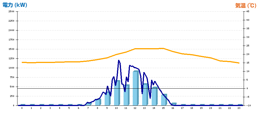 | 時刻 | 日射強度 (kW/㎡) | 気温 (℃) | 発電電力量 (kWh) | CO2削減量 (kg-CO2) | 売電金額(概算) (円) |