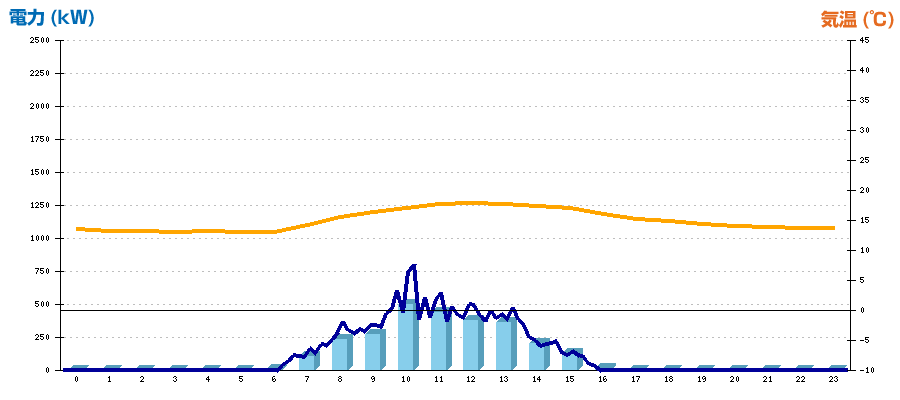 | 時刻 | 日射強度 (kW/㎡) | 気温 (℃) | 発電電力量 (kWh) | CO2削減量 (kg-CO2) | 売電金額(概算) (円) |